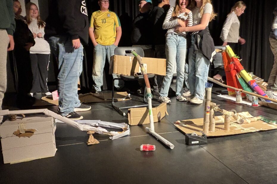 Der 6. Jahrgang präsentierte in der letzten Woche die Murmelbahnen, die in kleinen Gruppen gebaut wurden. Unter anderem musste jede Murmelbahn eine Länge von 1,50 Meter, mindestens eine Rampe und Kurven besitzen. Die Klassen 6b und 6c führten ihre Bauwerke auf der Bühne im Scheinwerferlicht vor. Nicht alles klappte, was aber nicht schlimm war. Konstruktionen wurden schnell verbessert, die Murmeln konnten rollen. Jede Gruppe hielt einen kurzen Vortrag, um die einzelnen Bauschritte darzustellen. Wir freuen uns auf die nächsten Projekte.