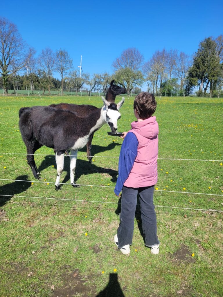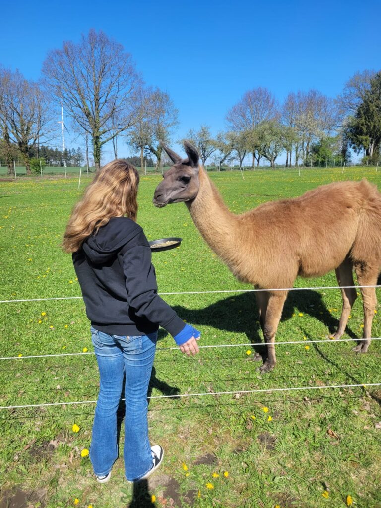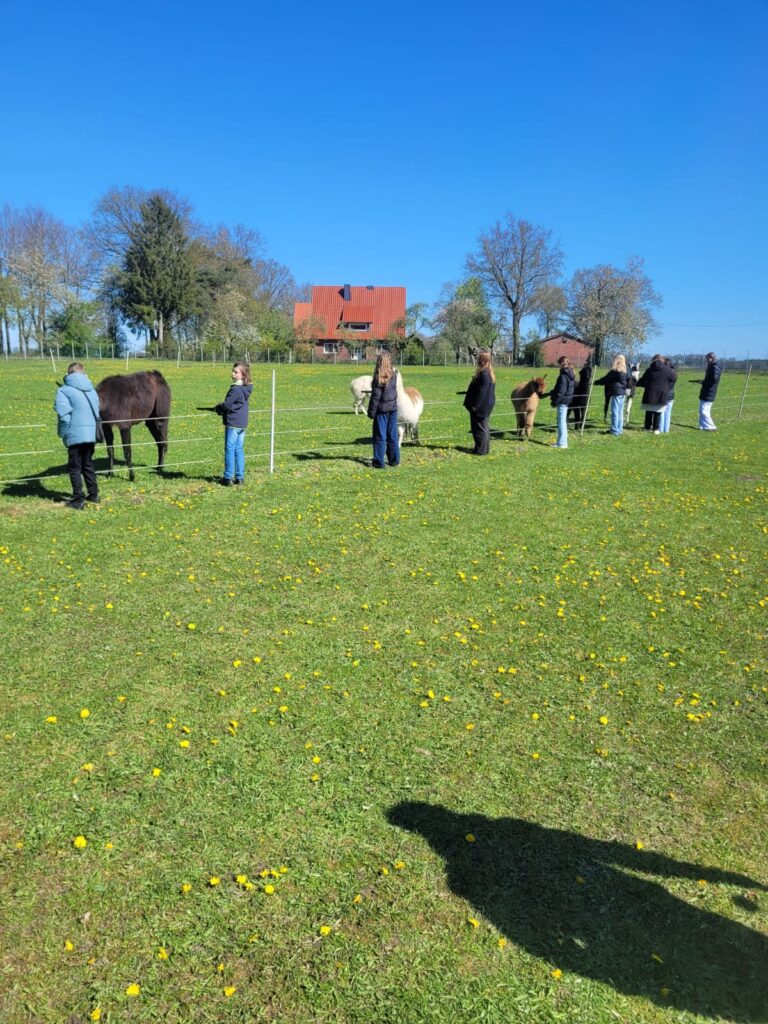 Am 21.04.2025 besuchten einige unserer Schülerinnen und Schüler einen Lama- und Alpakahof. Mit großem Interesse wurden dabei nicht nur die Tiere bestaunt, sondern auch Mandalas aus Naturmaterialien gebastelt und das Verhalten gegenüber den Lebewesen des Waldes besprochen.